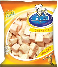 يعرف القلقاس بحجمه الكبير وجودته ( كل عبوة من القلقاس تحتوى على السلق اللازم لطهى القلقاس).